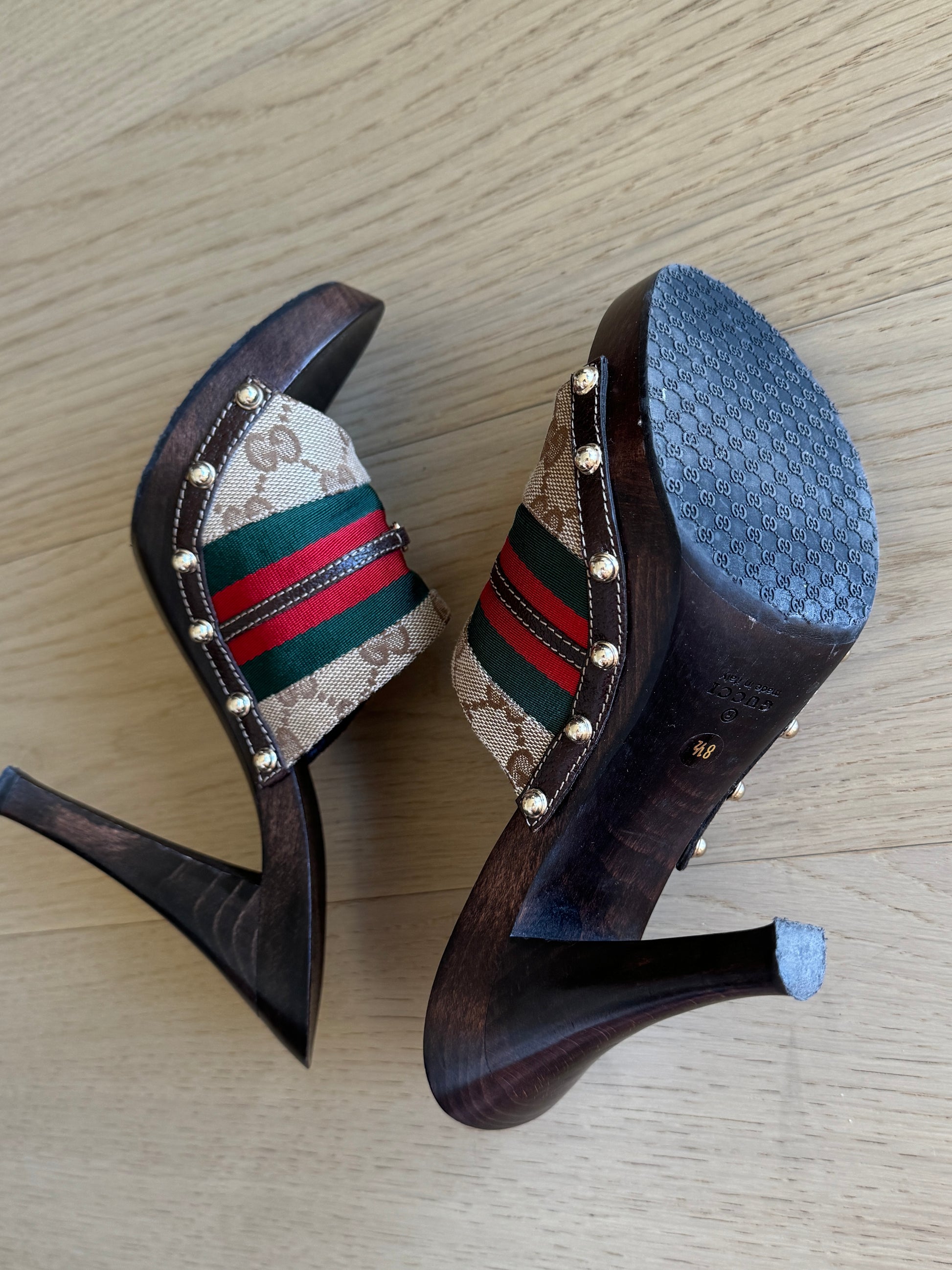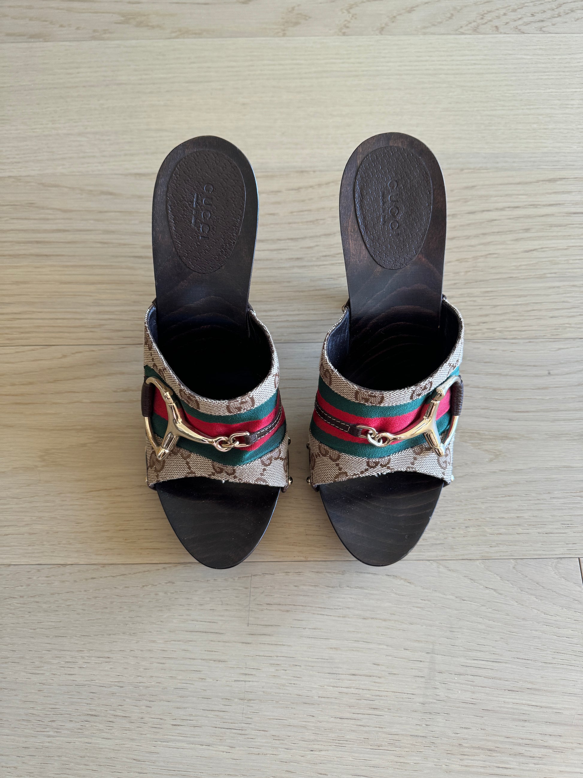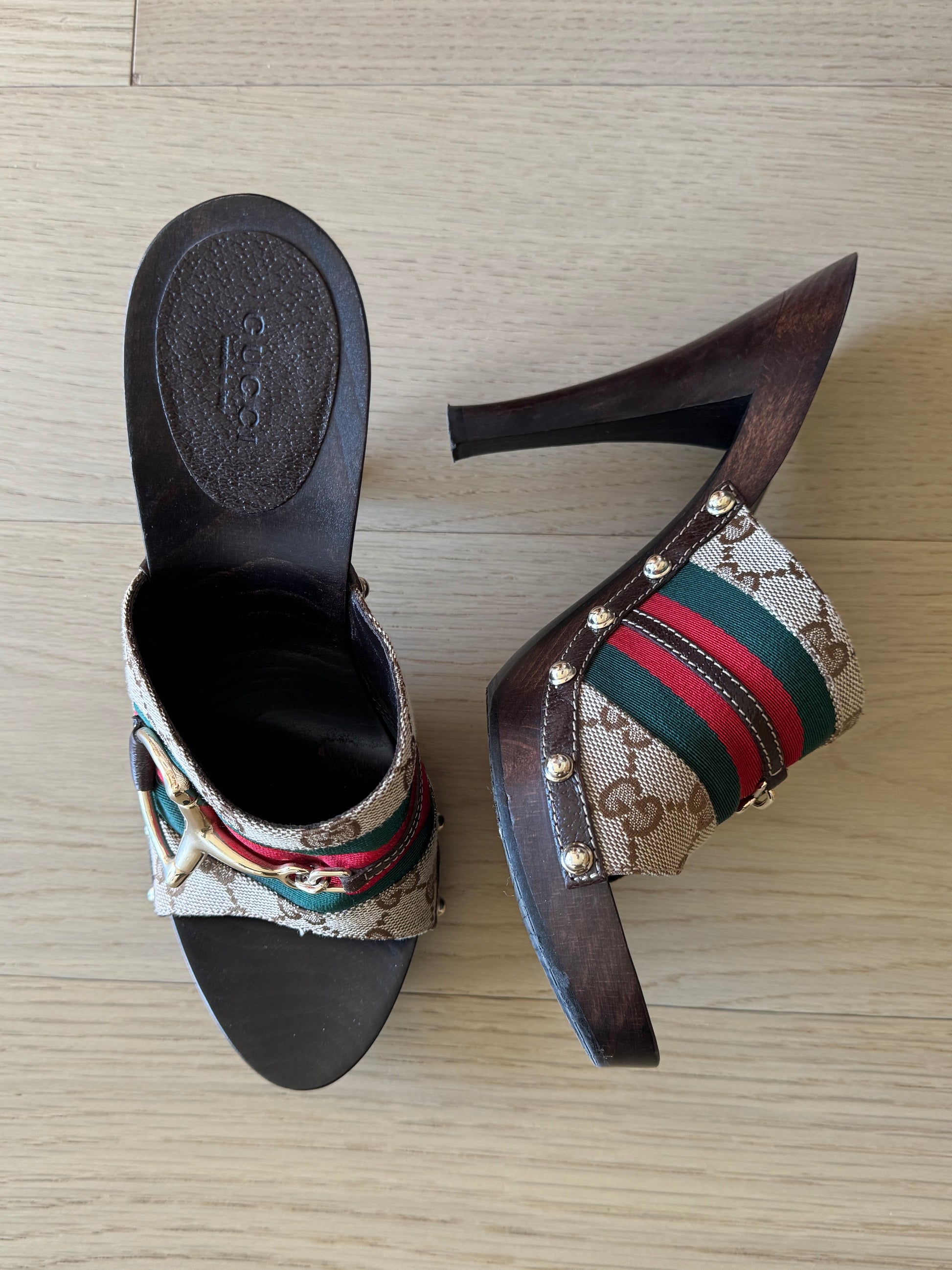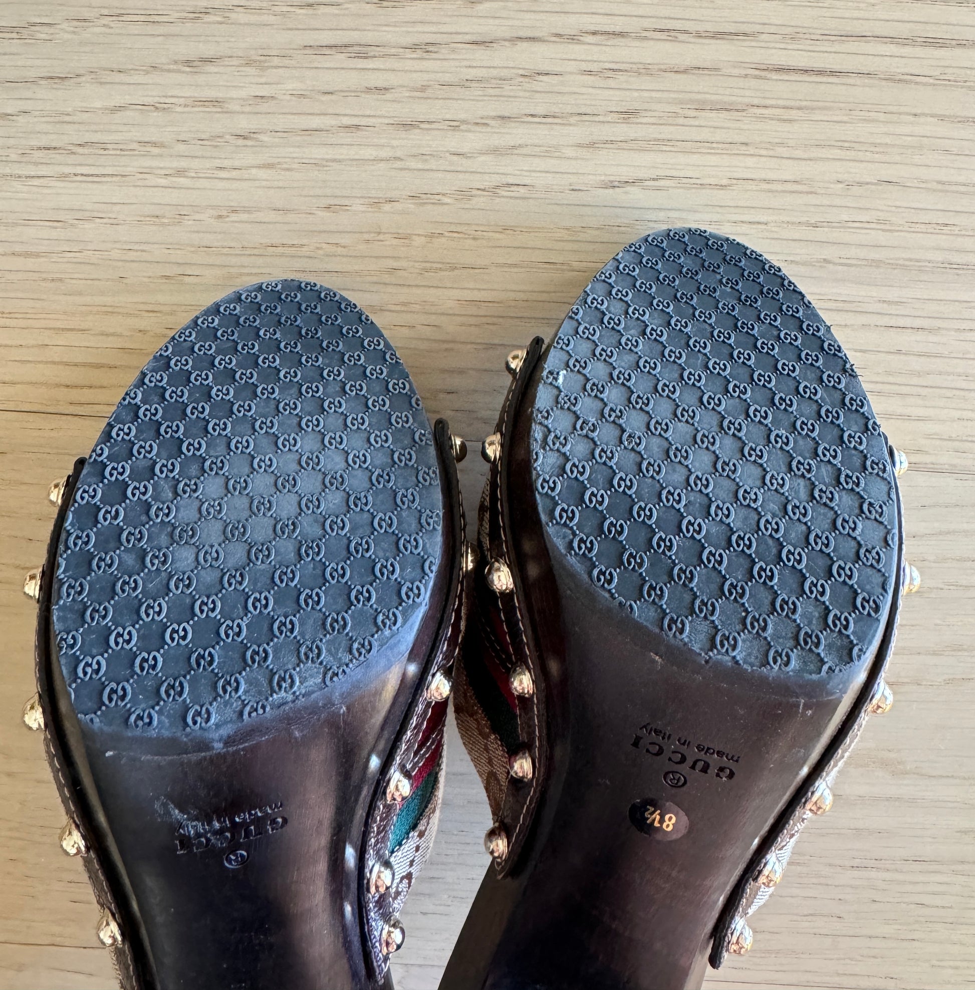 Vintage Gucci monogram heel with silver horse bit accents. Heel height 5”.